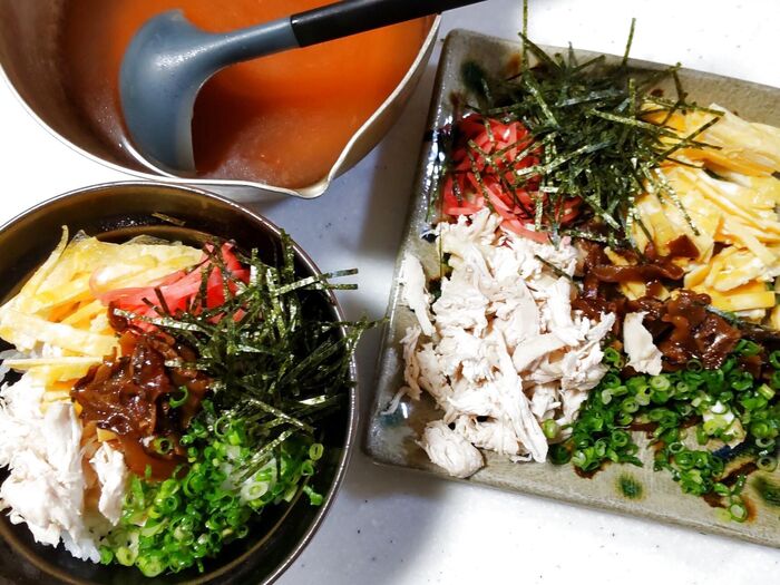 その美味しさに感激し、今度は、奄美大島で食べた郷土料理「鶏飯」料理をポケットシェフで再現しました。完成したポケットシェフで作った鶏肉を、鶏飯の出汁にサッと茹でて旨味を移し温め、フォークで食べやすくほぐします。