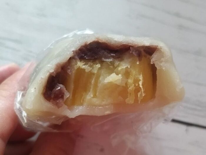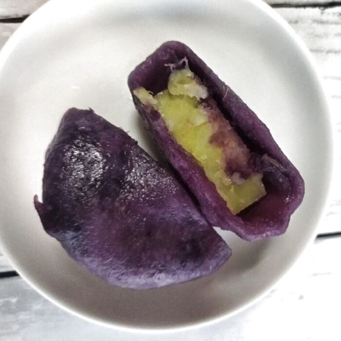 もっちりした皮の中には、輪切りにした2cmのサツマイモと餡が、包まれています。