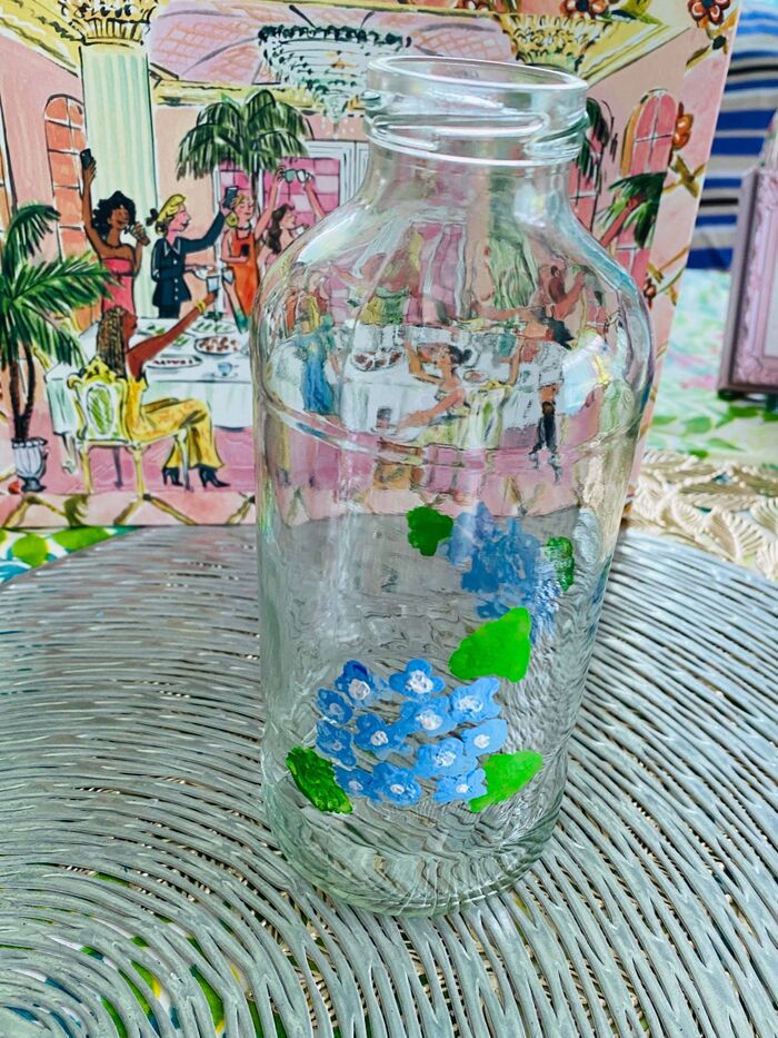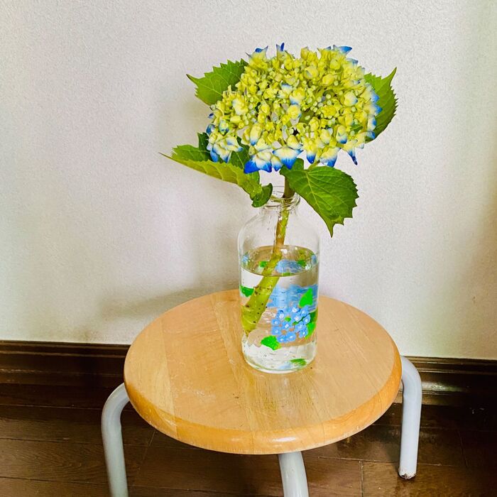 今回使用した花瓶は、面白い形のリサイクル瓶を使って、綿棒とアクリル絵の具で紫陽花の絵を描いて作りました。
