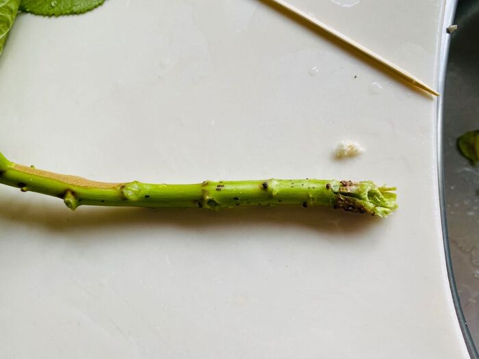 朝夕の涼しい時に剪定鋏で斜めにカットします。