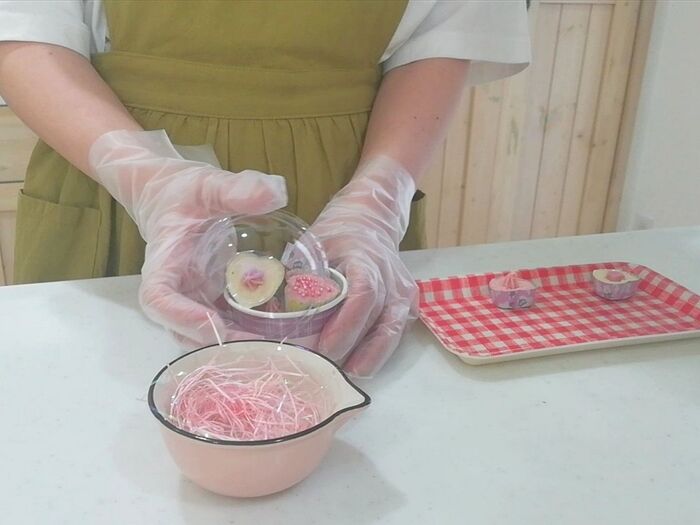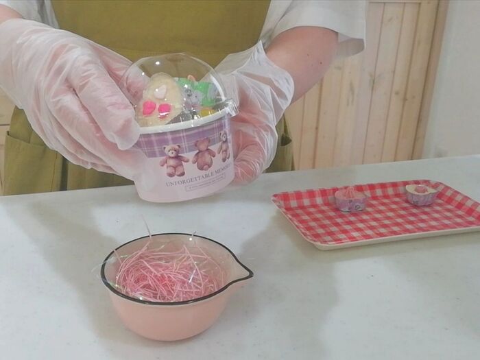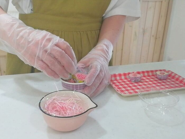 カップにペーパークッションを入れ、ラップを敷き込む。