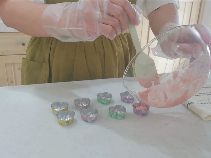 型に均等に流し込み、台に数回落とし気泡を抜く。