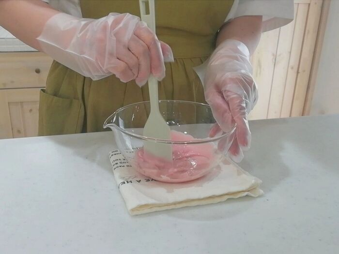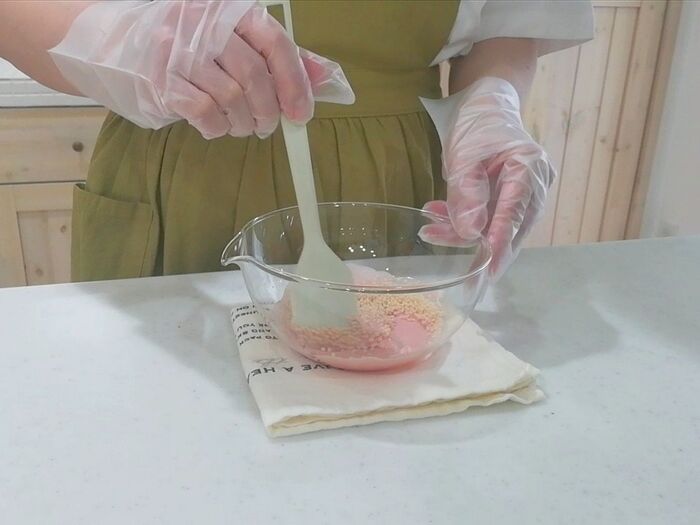 ピンクチョコ、ホワイトチョコ共に600Wのレンジで1分加熱しザッと混ぜたら、再び600Wのレンジで10秒加熱する。