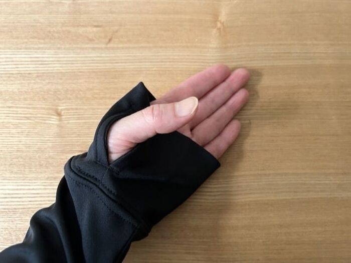親指を出せるサムホールも入っていて、手の甲までしっかりと覆われるのも安心ポイント。