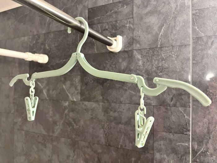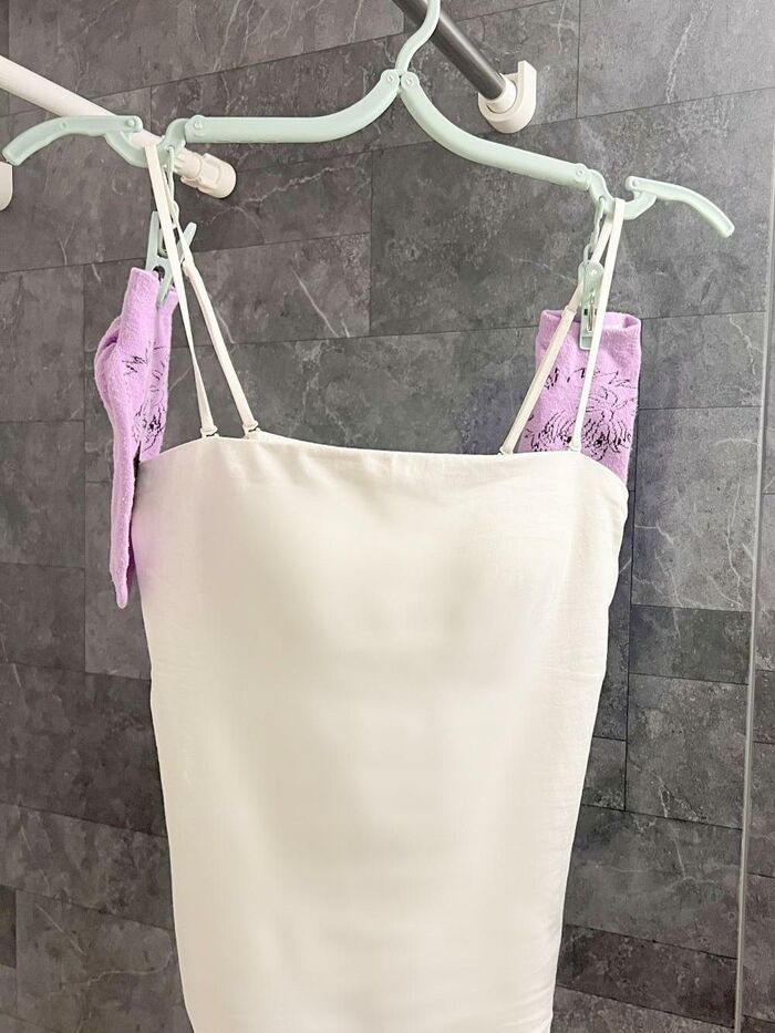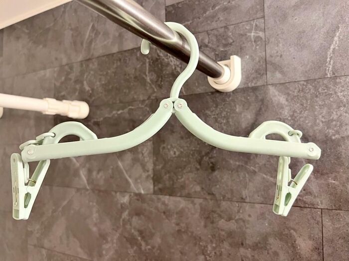 このように凹み部分にはキャミソールのストラップ、洗濯ばさみには靴下やハンカチなど小さいアイテムをかけることが可能。