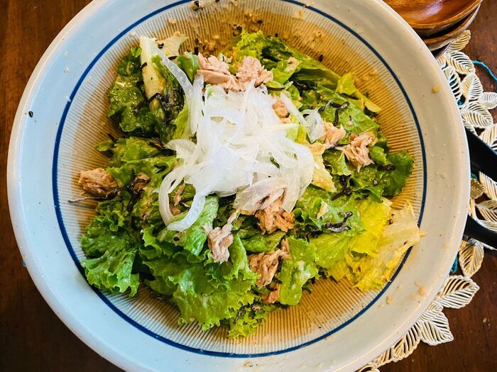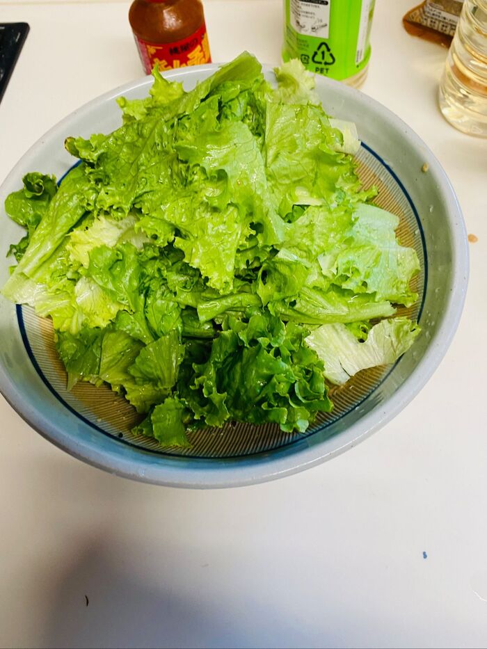 水で洗ってよく水気を切ったリーフレタスを手でちぎって入れます。
