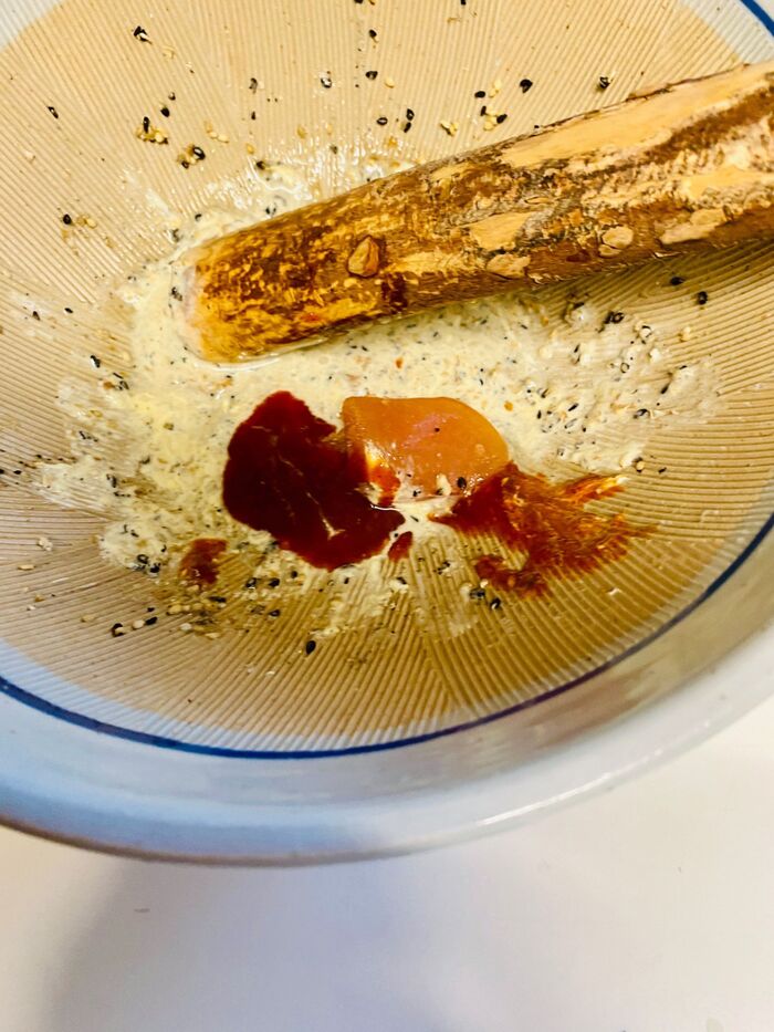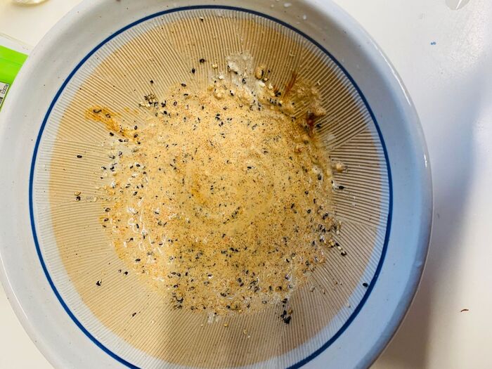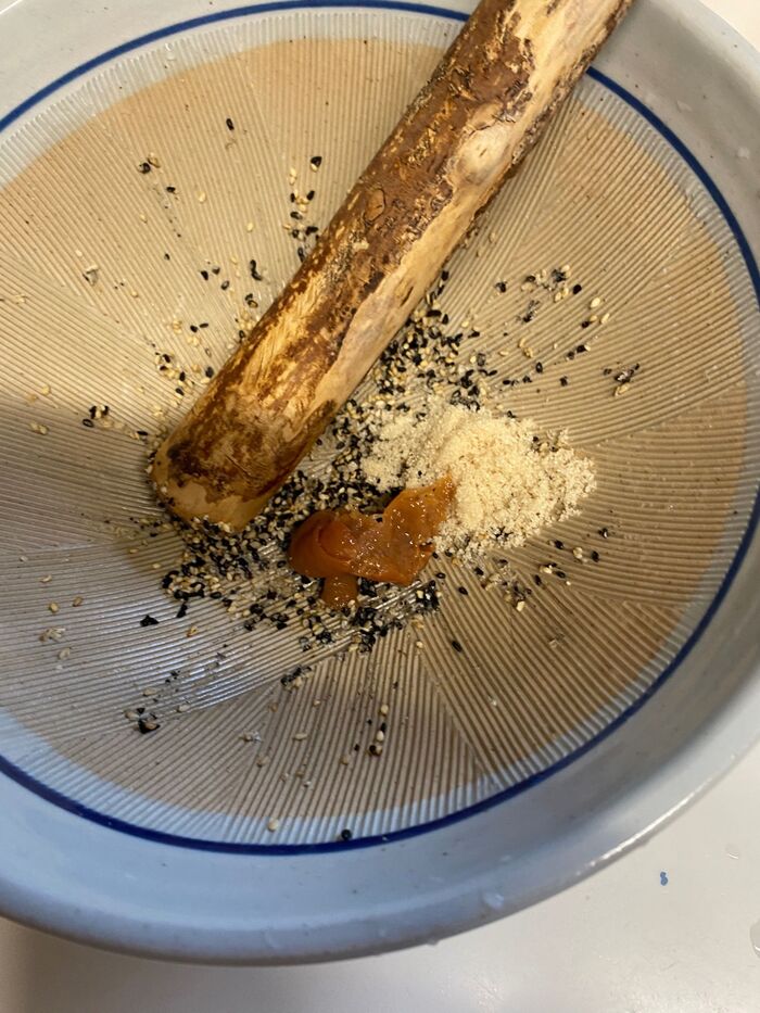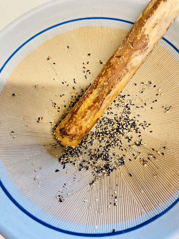 すり鉢に、白ごま、黒ごまを入れすり潰します。