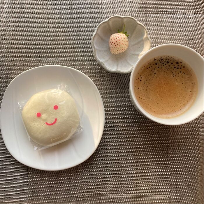 バルコニーで今朝収穫した白いちごとコーヒーとで朝ごはんとしていただきました。
