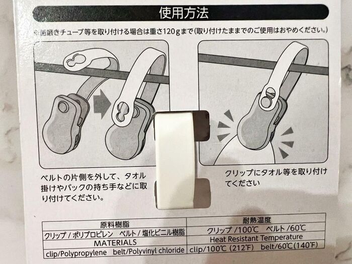 ベルトの片側を外して、タオル掛けやバッグの持ち手に取り付けるのみ!