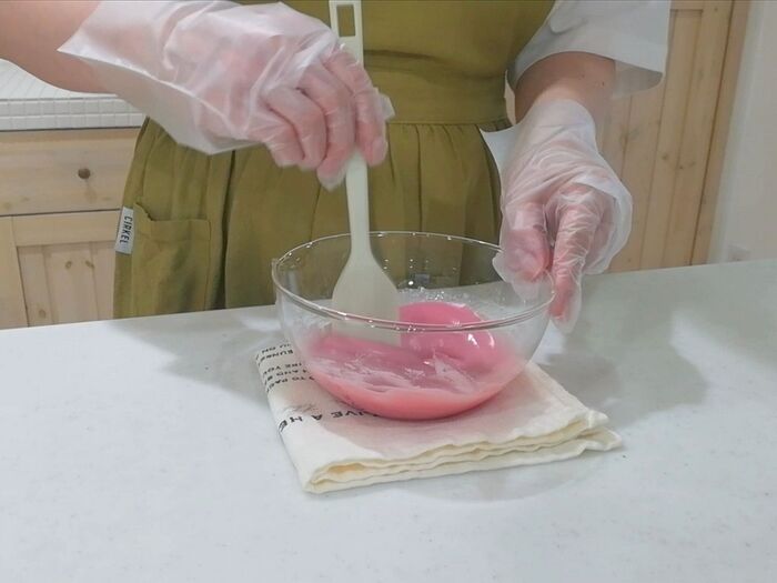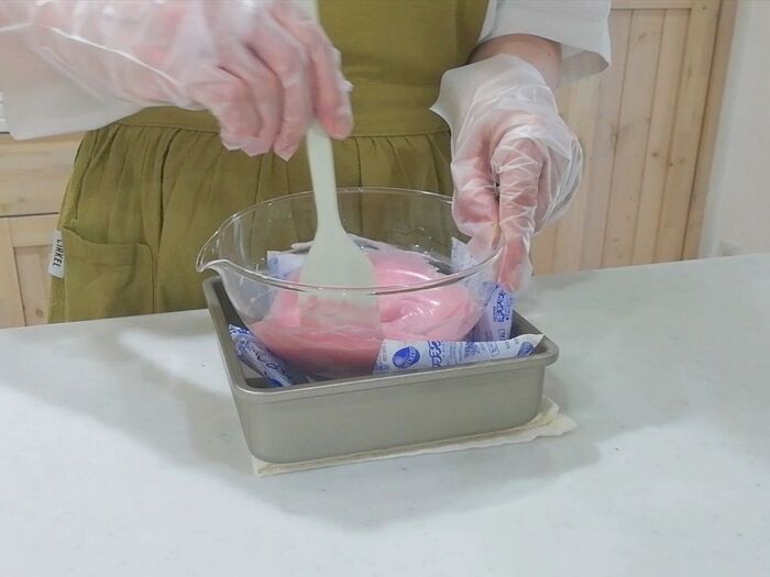 保冷剤や氷水につけ絞りやすい固さになるまで冷やす。