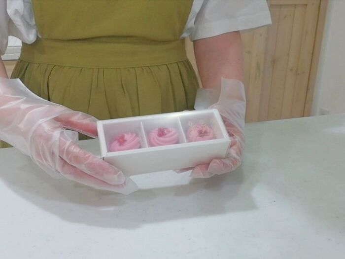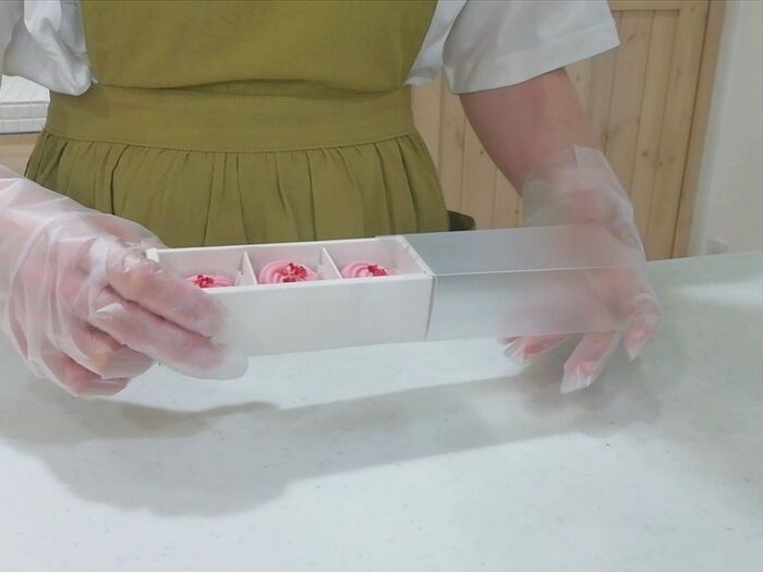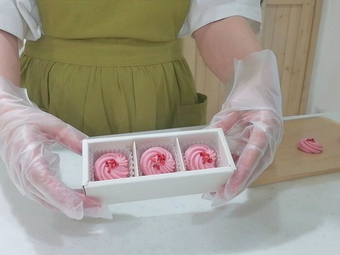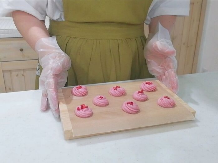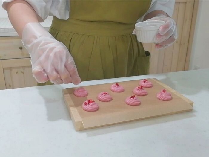 クッキングシートの上に丸く絞りフリーズドライイチゴを載せる。