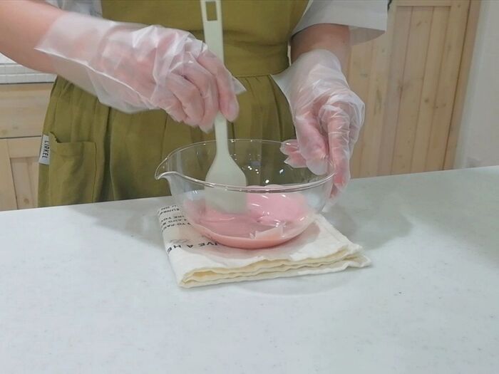 耐熱容器にピンクチョコレートを手で適当に割り入れ、600Wのレンジで1分10秒加熱する。