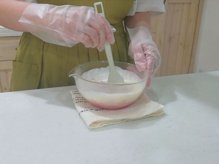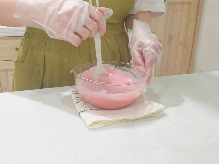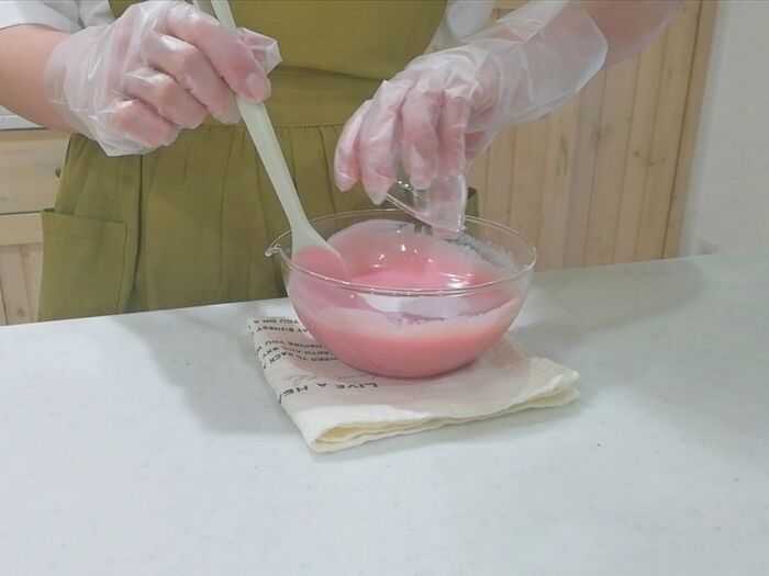 一見溶けていないように見えても中は熱く、混ぜると溶けるのでしっかりと艶が出るまで混ぜる。