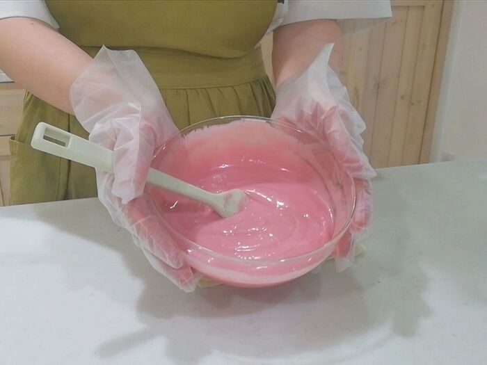 チョコレートが溶け艶が出るまで混ぜたら苺パウダーを加える。