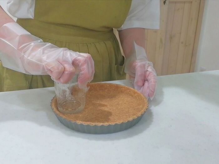 型に敷き詰めグラスの底等で押し固めたら、生チョコを作る間、冷蔵庫で冷やしておく。