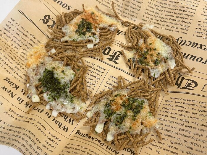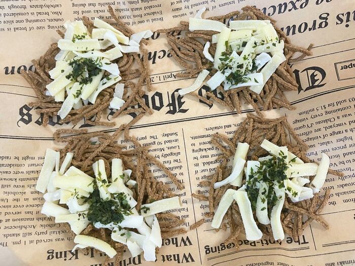 クッキングシートの上に、ブランリッチを広げたら、上からピザチーズを乗せ、お好みで青海苔や七味唐辛子などをトッピングします。