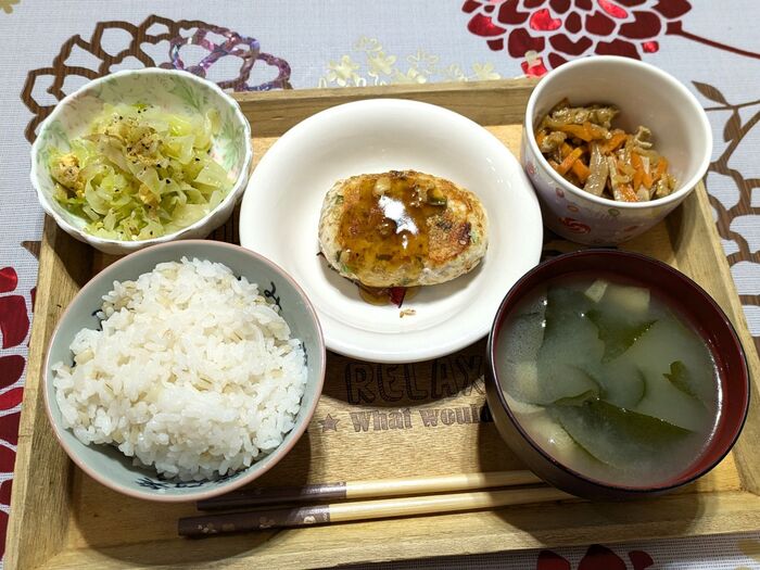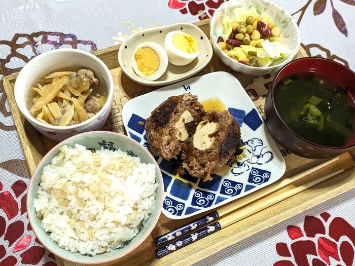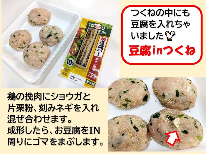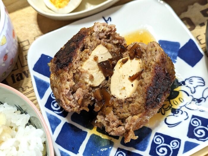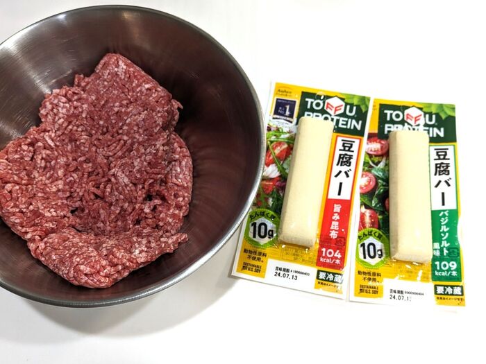 バシルソルト風味、旨み昆布の豆腐バーを半分にカットして、ハンバーグの中に入れちゃいました!