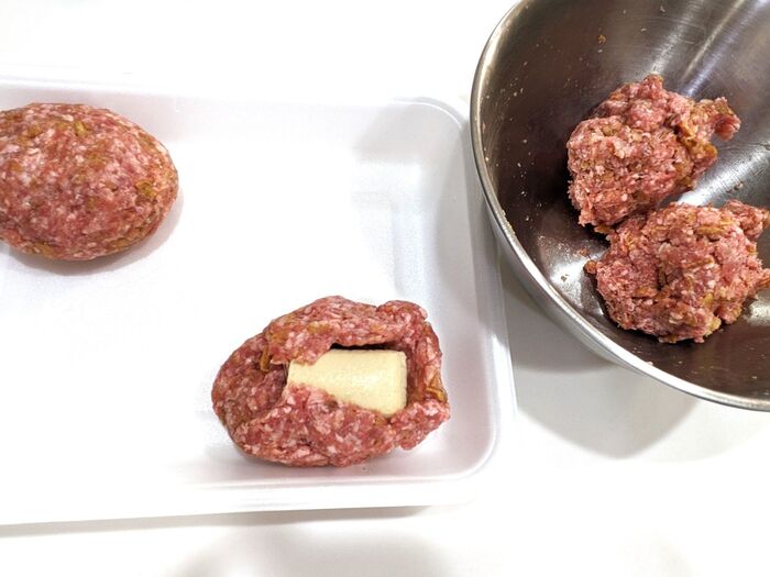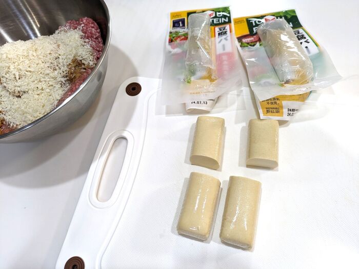 材料を混ぜあわせ、たねのなかに適量にカットした豆腐バーを入れていきます。