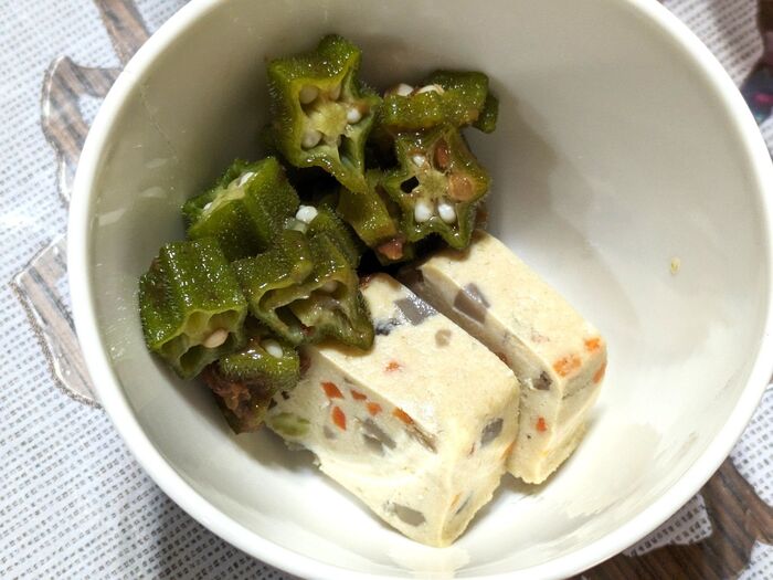 オクラを茹でてカットし、調味料で和えてゆきます。