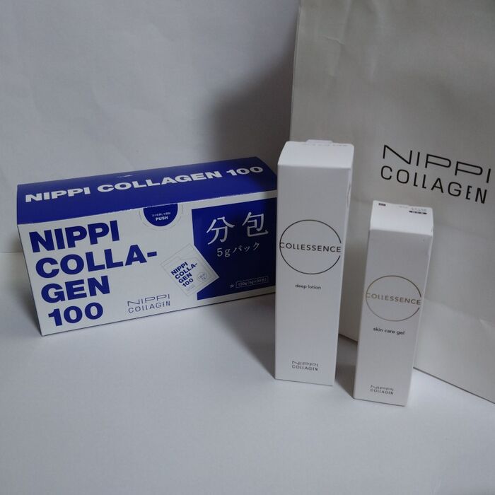 左からニッピコラーゲン100(5gパック×30包)、コレセンスディープローション(新登場の化粧水だそうです!)、コレセンススキンケアジェル。