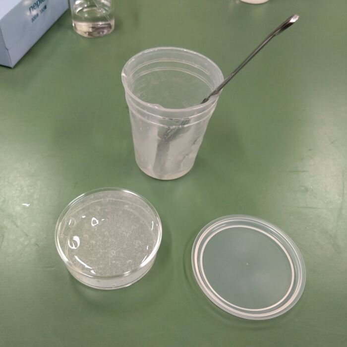 こちら、実際に作った生コラーゲン。中性になると透明で逆さにしてもたれてこないそうなのですが、なかなかちょうどいい感じにならなくて。出来上がらなかったらどうしようと一瞬思いましたが、助けもあって無事、完成!ちょっと焦りましたが面白かったです。