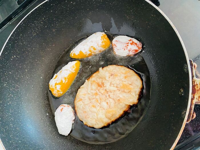 お弁当のおかずはフライパン1つで作るもので、隙間でとんかつなどを揚げ焼きしながら焼いています。