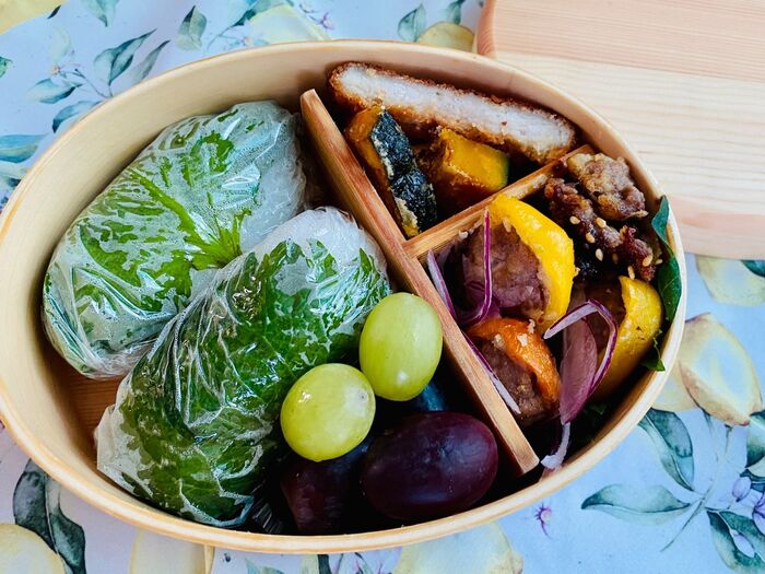 大葉のおにぎり(中は梅干し、昆布の佃煮)、フルーツを添えて出来上がり!