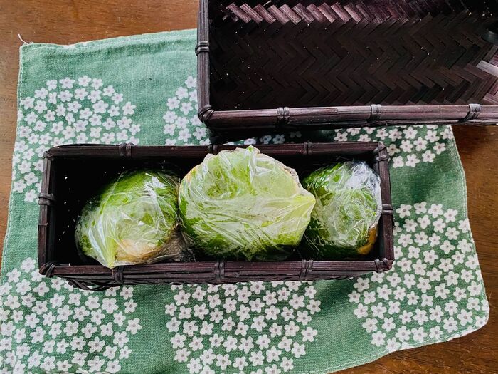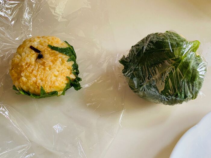 大葉はサッと水洗いしてクッキングペーパーで水分を拭き取りおむすびを包みます。