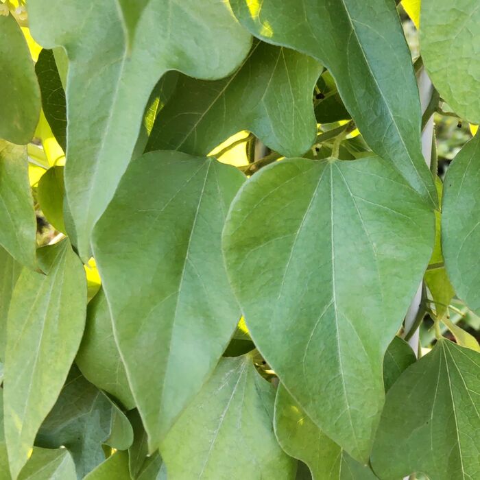 葉は長さ3~12cmの薄い緑色で、つるから互い違いに生じます。縁にギザギザはなく、基本は広い卵形ですが、色々な形の葉が混在しています。画像の中の葉も、丸いものと、そうでないものがありますよね。