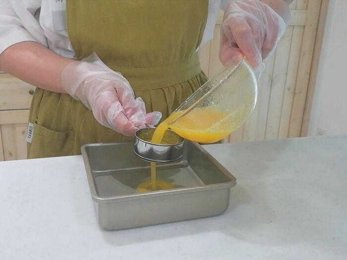 沸騰した時の泡を取るため漉しながらバット等に流し込み、冷蔵庫で冷やす。