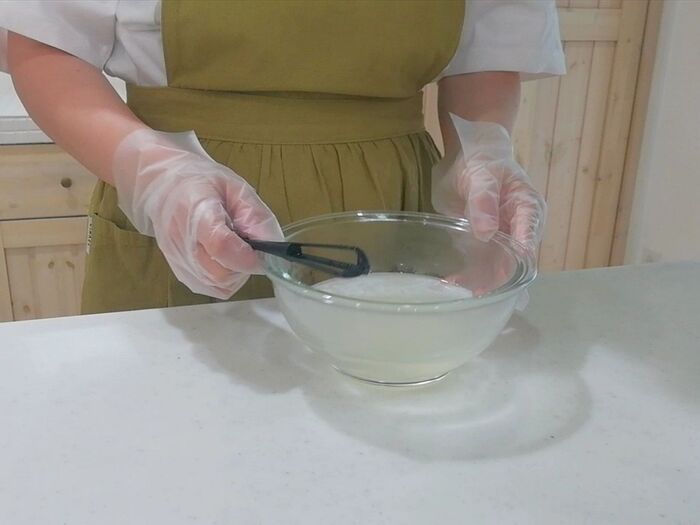 ラップをせずに600Wのレンジで1分加熱し、ムラなく混ぜる。