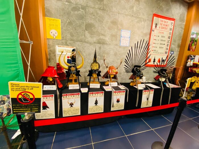 向かって左側から、黒田官兵衛の兜、後藤又兵衛の兜、加藤清正の兜、真田幸村の兜、豊臣秀吉の兜が展示されていました。