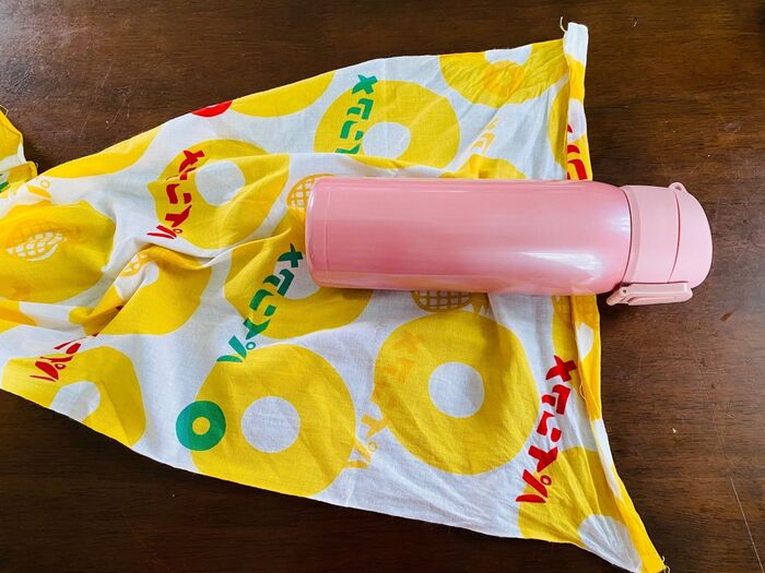 向かって右側の端っこを内側に山折りし、水筒の口が前になるように乗せます。