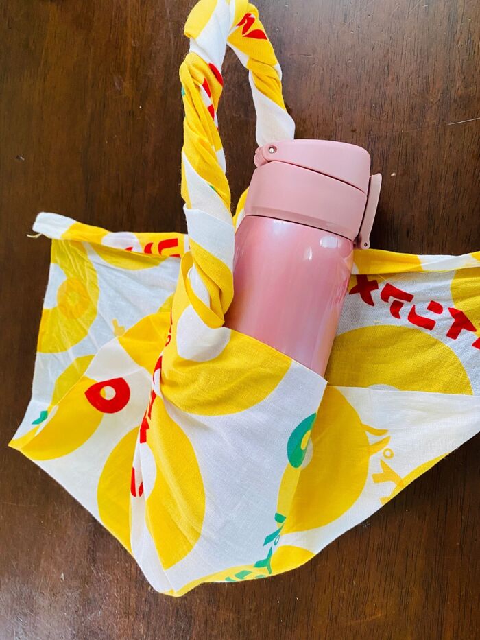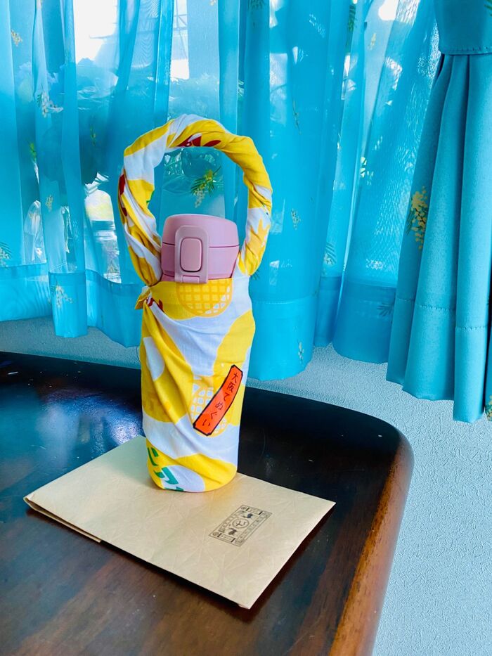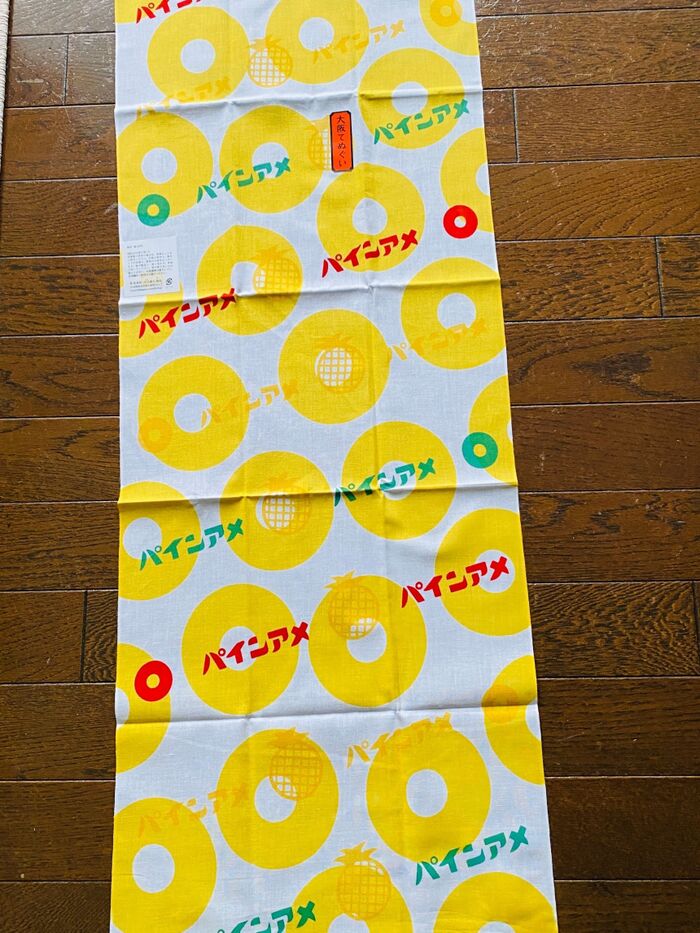 今回は、元気な黄色のパインアメ柄の手ぬぐいを使って、切らない!縫わない!水筒カバーにしてみたいと思います。