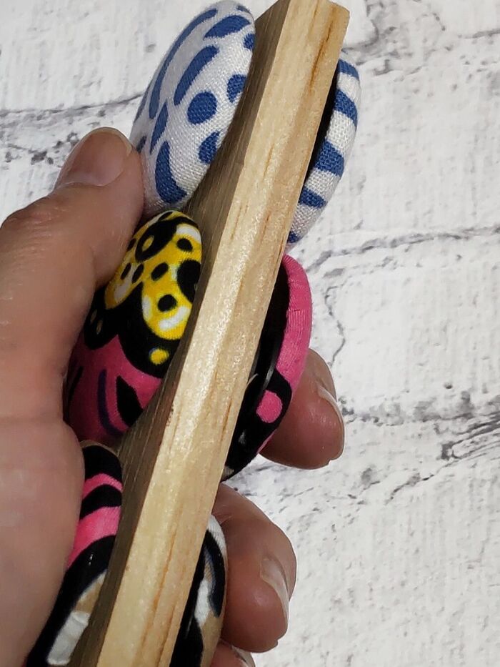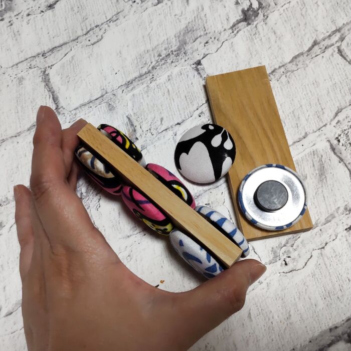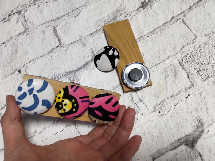 くるみボタンマグネットを6個用意します。くるみボタンマグネット6個を使い、蒲鉾板を挟めば完成です。