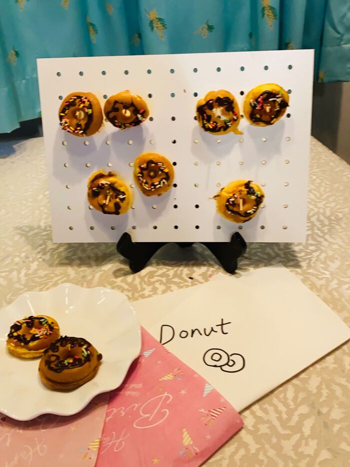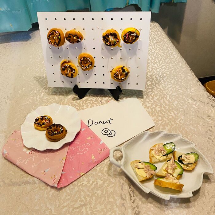 ホワイトパンチングボードの穴に爪楊枝などを刺してドーナツを飾ります。