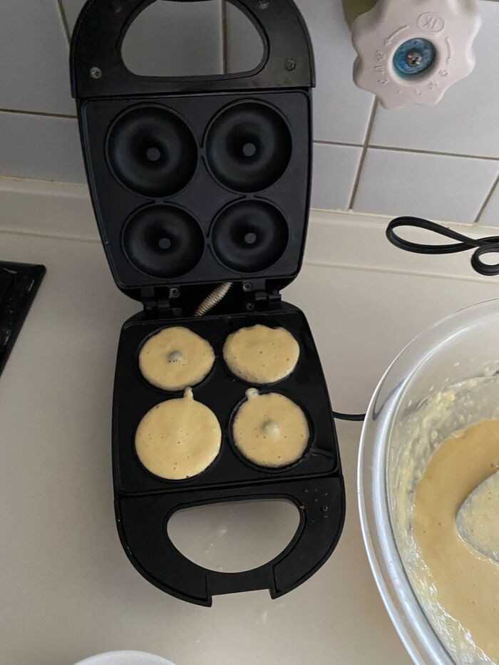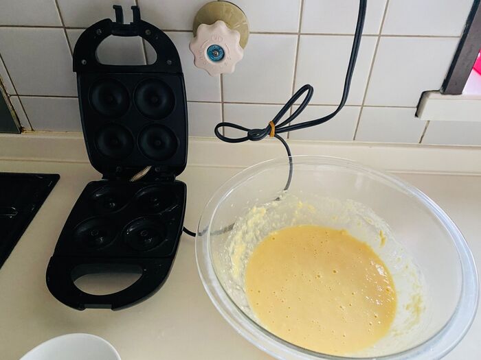 ドーナツ型のホットプレートに薄く油を塗り生地を入れます。