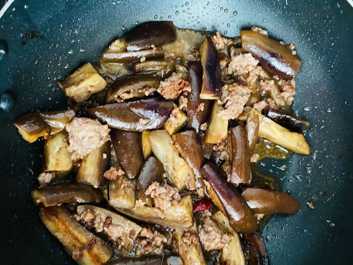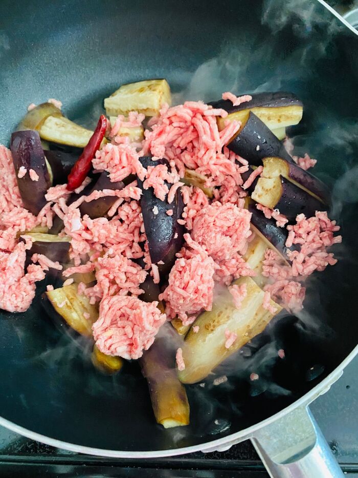 フライパンにひき肉、茄子、鷹の爪を入れ炒めます。