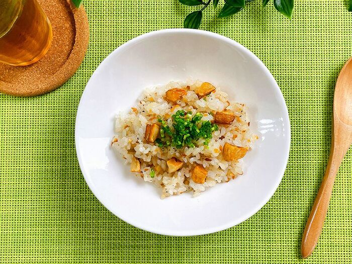 ご飯を加えてニンニクオイルとよく馴染ませ炒める。〇ごと万能おだしを鍋肌から回し入れ炒め合わせたら、取り出しておいたニンニクを戻し入れ、胡椒を振ってひと混ぜする。器に盛り付け、万能ねぎを添える。
