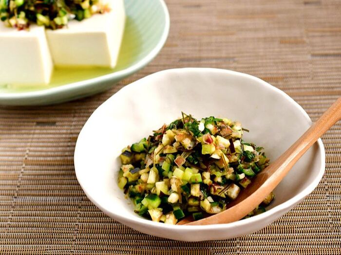 茄子ときゅうりは、すべて粗くみじん切りする。大葉は細切り、ミョウガはみじん切りしておく。細切り昆布もハサミで5mm長さに切っておく。