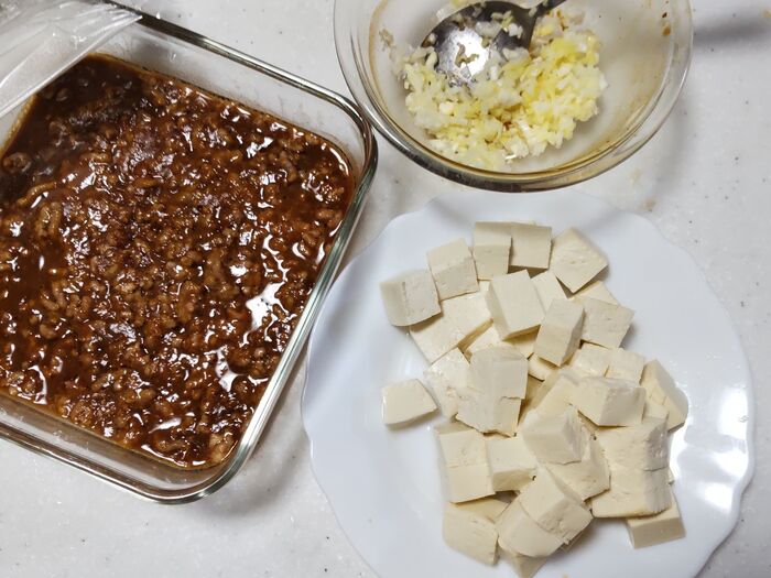 ④ 耐熱容器に③で混ぜ合わせた調味料とひき肉を入れ、混ぜてから平らにします。ラップをして、電子レンジ(600W)で2分加熱します。