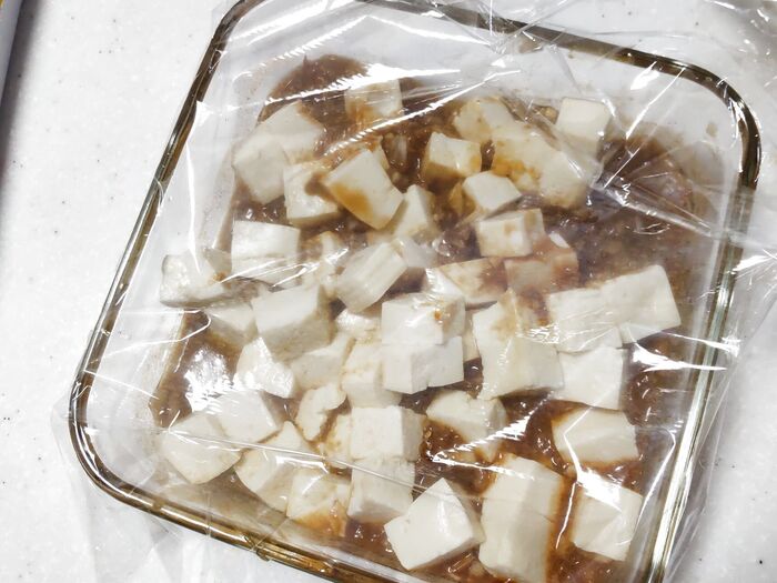 ⑥ ラップをして、電子レンジ(600W)で2分加熱します。ラップを外し、豆腐が崩れないように優しく全体を混ぜます。