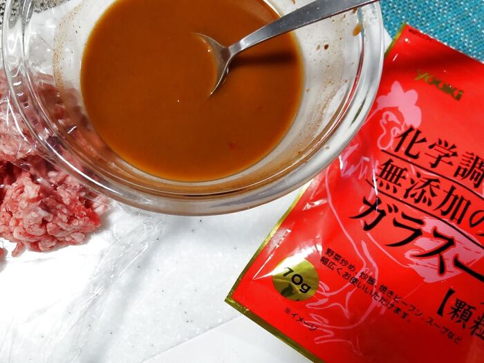 ③ △の材料をみじん切りにし、@の調味料を順に加えます。まず鶏ガラスープ(顆粒)と片栗粉、水を混ぜ、その後、豆板醤、醤油、砂糖、赤みそを加えて、全体がよく混ざるまで混ぜ合わせます。