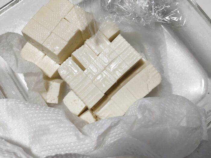 ① 豆腐を2cm角に切り、キッチンペーパー1枚を耐熱容器に敷いてその上に豆腐を置き、さらにもう1枚のキッチンペーパーで豆腐を包みます。ラップをして、600Wの電子レンジで2分加熱し水きりします。