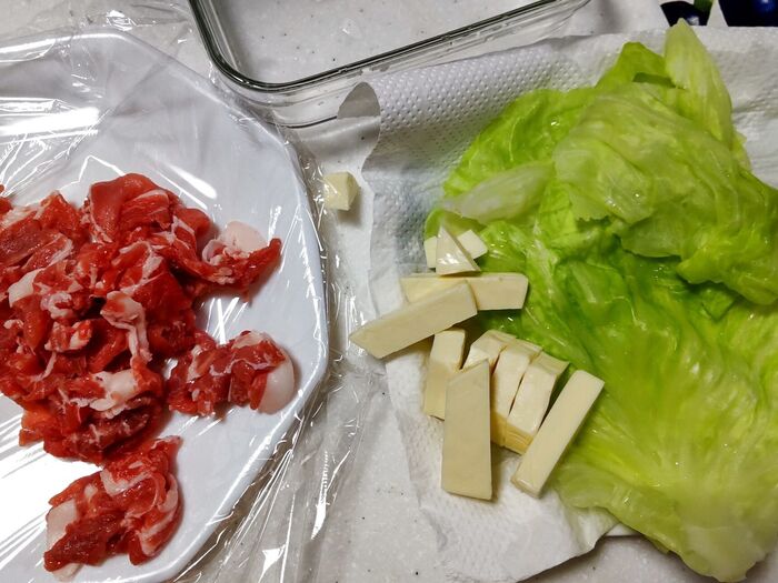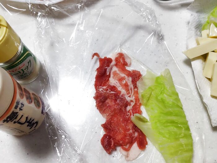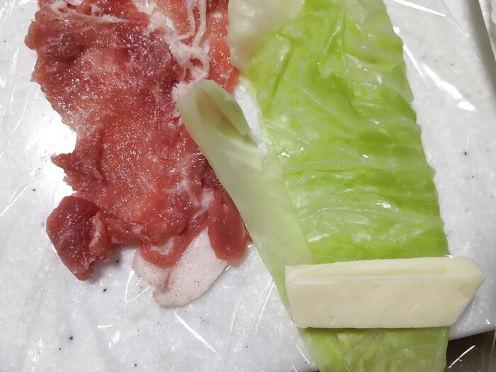 ③大きめのラップを敷き、豚薄切り肉2枚を少し重ねながら縦長に広げます。キャベツも肉に合わせて縦半分に折ります、大きい場合は手でちぎって小さくします。