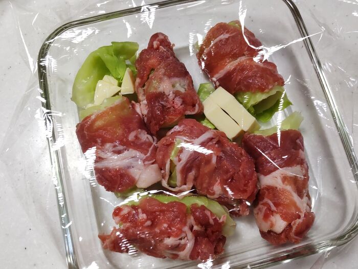 ⑤肉の上に、巻いたキャベツを芯にしてくるくると巻きます。ラップを使うと手が汚れにくいので便利です。これを6個作り、耐熱容器に並べます。残ったキャベツやチーズは、耐熱容器の隙間に入れておきます。お好みでハーブ系の香りを加えたい方は、上から少量振りかけても良いでしょう。ただし、なくても十分美味しく仕上がります。