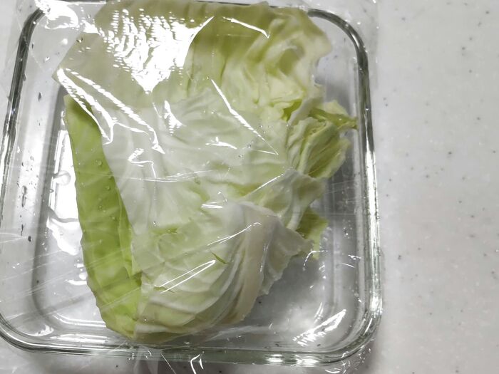 ①キャベツは束の状態を保ちつつさっと洗い、耐熱容器に入れてラップをします。電子レンジ(600W)で約2分加熱後、火傷に注意しながら水で冷やし、キャベツを軽く絞ってからキッチンペーパーで水気を拭き取ります。耐熱容器も軽く水で流し、キッチンペーパーで水気を拭き取っておきます。