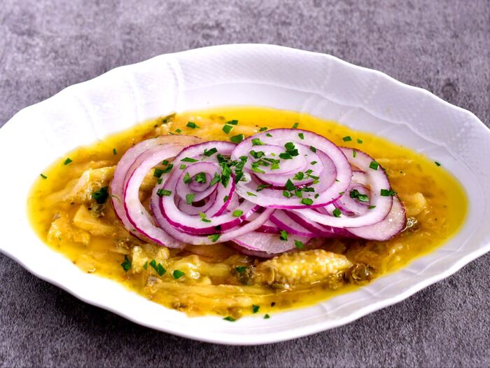 器に手順2.と紫玉ねぎ、パセリを飾る。