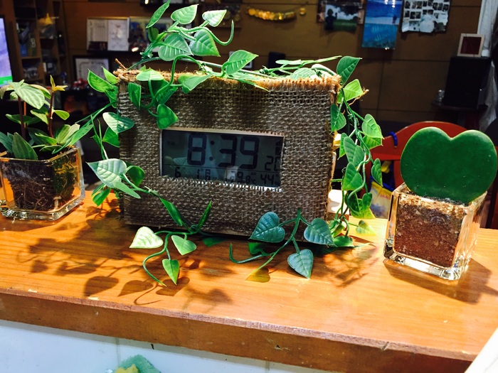 セリアのランチョンマットを木箱の大きさに合わせて切り(前面、後面、両サイド、上部それぞれ1枚づつ)それぞれを木工用ボンドで貼り付けます。但し、前面に貼るランチョンマットは時計のデジタル表示部分が見えるように切り取ってから木箱に貼り付けます。