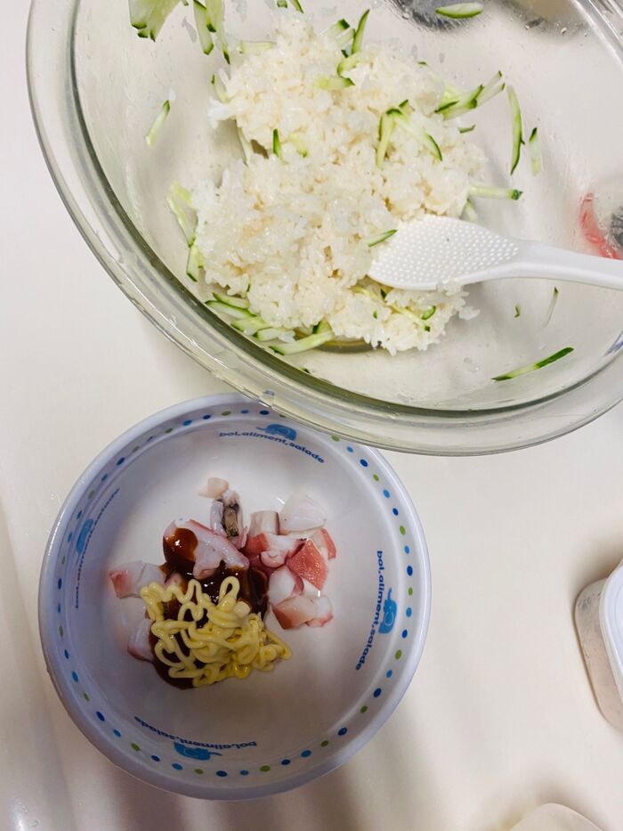③たこは細く切ってマヨネーズ、キムチで和えます。